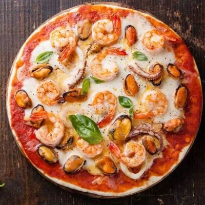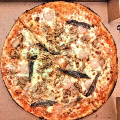 Tomato BASE, Bacon, Red Onions, Cheese, Anchovies and Prawn.