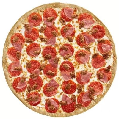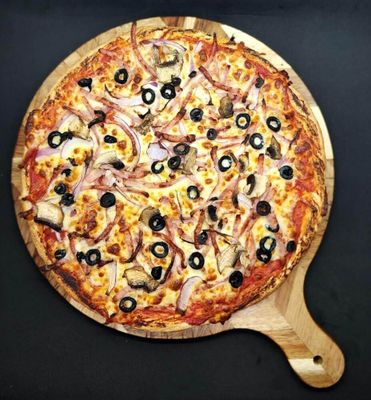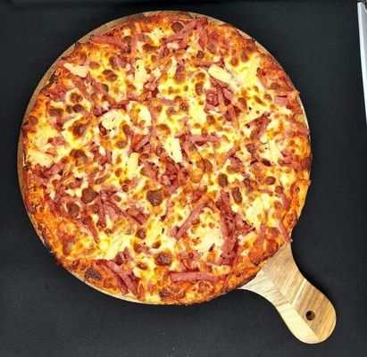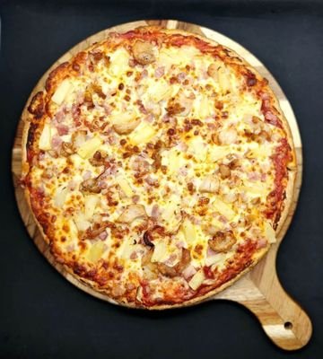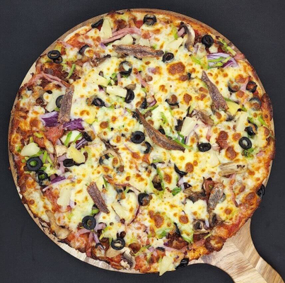 Tomato BASE, Beef, Ham, Pepperoni, Capsicum, Mushrooms, Olives, Pineapple, Red Onions, Cheese and Anchovies.