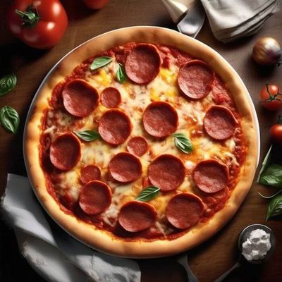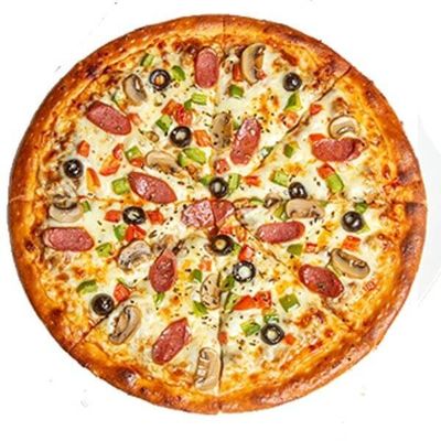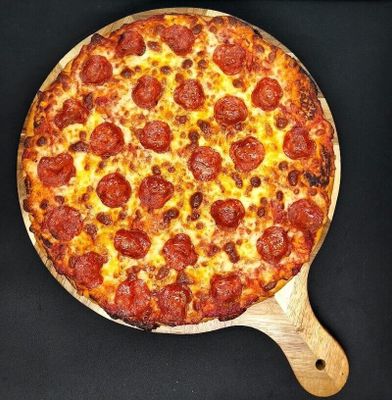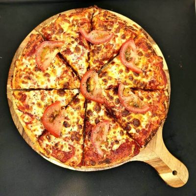Tomato BASE, Pepperoni, Capsicum, Fresh Tomato, Olives and Cheese.