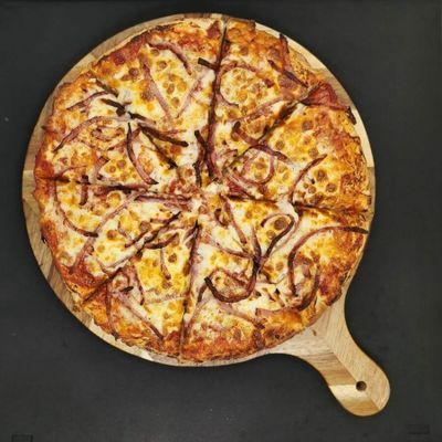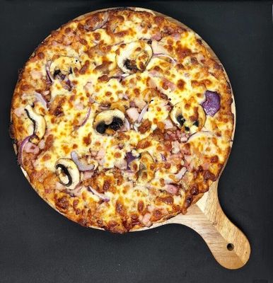 Tomato BASE, Bacon, Egg, Capsicum, Mushrooms, Red Onions and Cheese.