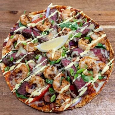 Tomato BASE, Avocado, Capsicum, Red Onions, SunDried Tomatos, Cheese, Prawn and Hollandaise Zig Zag.