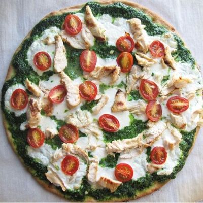 Basil Pesto BASE, Chicken, Avocado, Fresh Tomato, Red Onions, Spinach, Brie and Cheese.